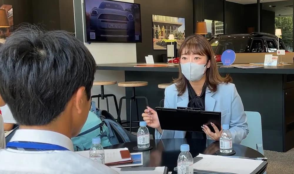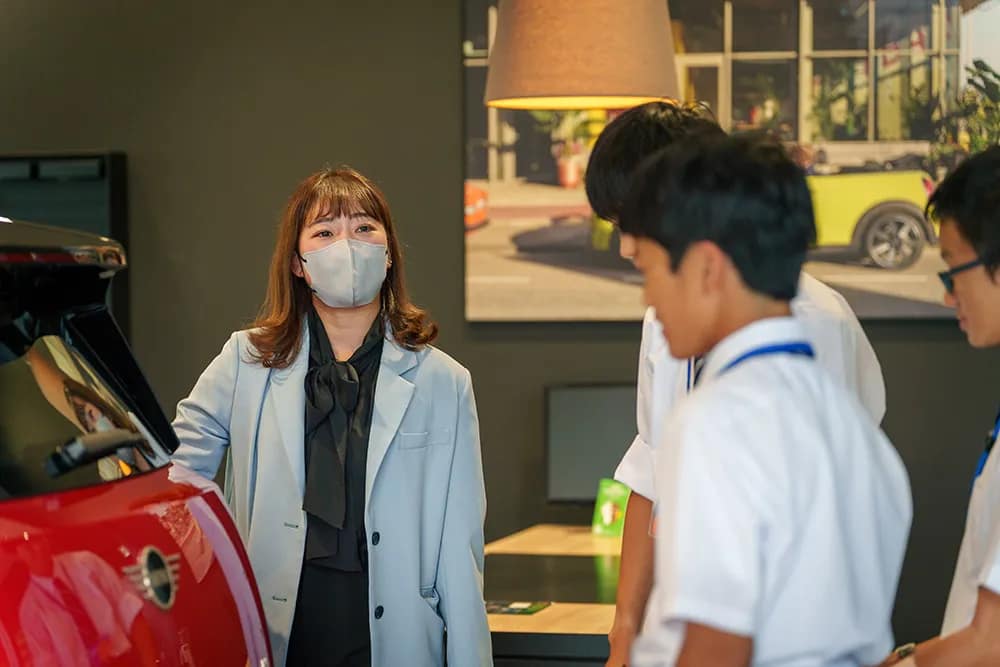 今回は、車好きの5名の中学生がNicole BMW 川崎本社の職場体験に参加。営業体験では、EVの試乗をはじめ、お客様への挨拶の仕方や名刺の渡し方にチャレンジ。整備士体験では、車両の下回りを見学しながらエンジンといった車を構成する部品を確認したほか、ホイールボルトの取り外しやタイヤの空気圧の調整にも挑戦。